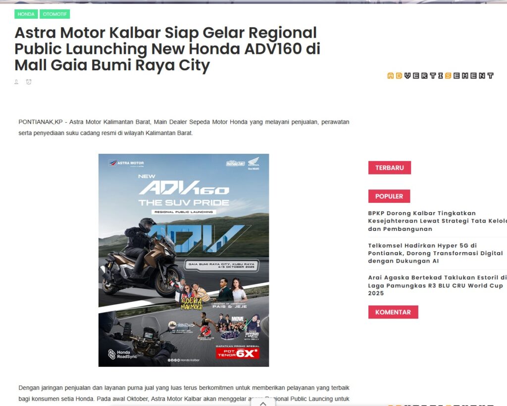 Astra Motor Kalbar Siap Gelar Regional Public Launching New Honda ADV160 di Mall Gaia Bumi Raya City by Muhammad Arif 3 Oktober 2025 in Silahkan kunjungi https://www.kapuaspost.web.id/2025/10/astra-motor-kalbar-siap-gelar-regional.html. Tags: astra Astra Motor kalbar Astra Motor Pontianak astramotor honda kalbar pontianak sepeda motor You Might Like Regional Public Launching New ADV160 The SUV Pride Grand Launching New PCX 160 Truly Exceptional! Tetap hati-hati ya bro sist berkendara saat hujan.