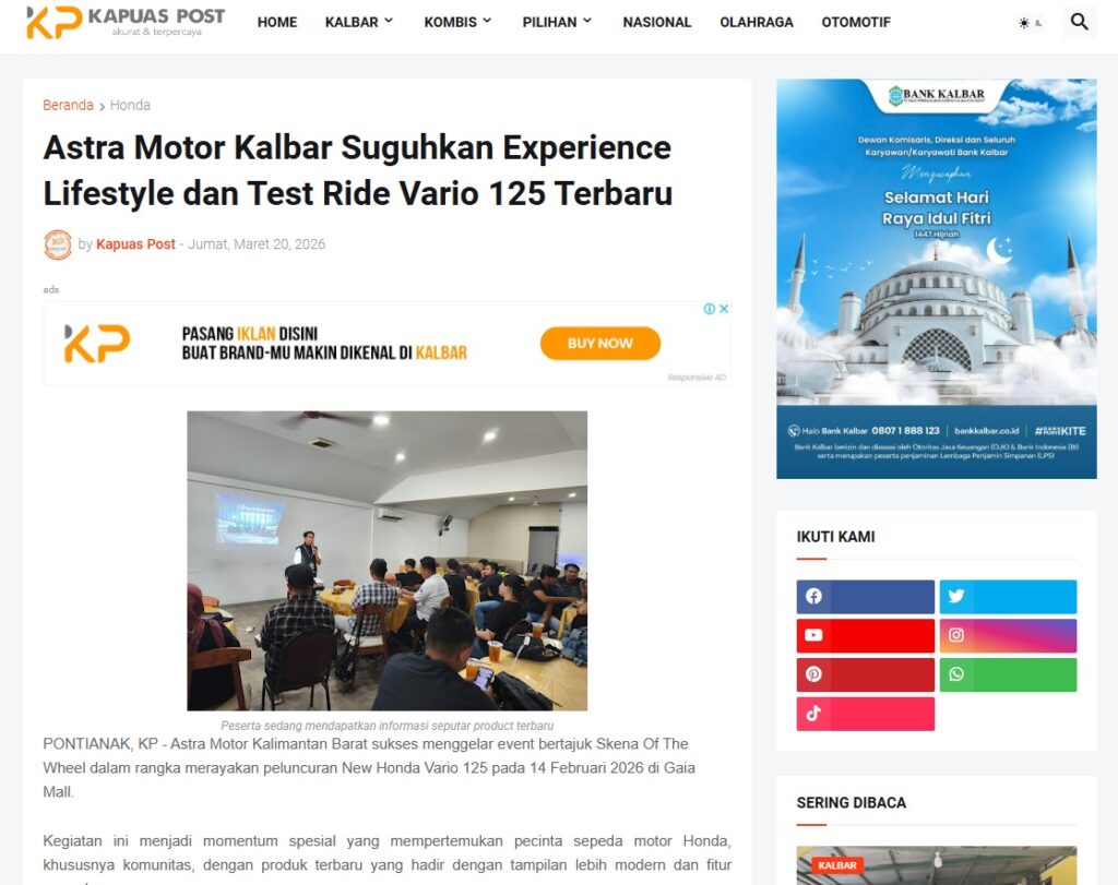 Astra Motor Kalbar Suguhkan Experience Lifestyle dan Test Ride Vario 125 Terbaru by Muhammad Arif 20 Maret 2026 in Silahkan kunjungi https://www.kapuaspost.web.id/2026/03/astra-motor-kalbar-suguhkan-experience.html`. Tags: astra Astra Motor kalbar Astra Motor Pontianak astramotor honda kalbar pontianak sepeda motor You Might Like Regional Public Launching New ADV160 The SUV Pride Grand Launching New PCX 160 Truly Exceptional! Tetap hati-hati ya bro sist berkendara saat hujan.