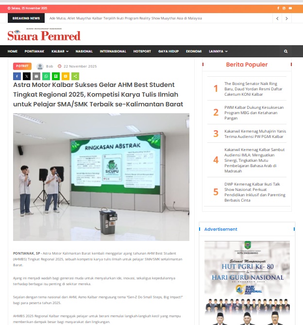 Astra Motor Kalbar Sukses Gelar AHM Best Student Tingkat Regional 2025, Kompetisi Karya Tulis Ilmiah untuk Pelajar SMA/SMK Terbaik se-Kalimantan Barat by masmul 22 November 2025 in Silahkan kunjungi https://www.suarapemredkalbar.com/read/potret/22112025/astra-motor-kalbar-sukses-gelar-ahm-best-student-tingkat-regional-2025-kompetisi-karya-tulis-ilmiah-untuk-pelajar-smasmk-terbaik-se-kalimantan-barat. You Might Like Regional Public Launching New ADV160 The SUV Pride Grand Launching New PCX 160 Truly Exceptional! Tetap hati-hati ya bro sist berkendara saat hujan.