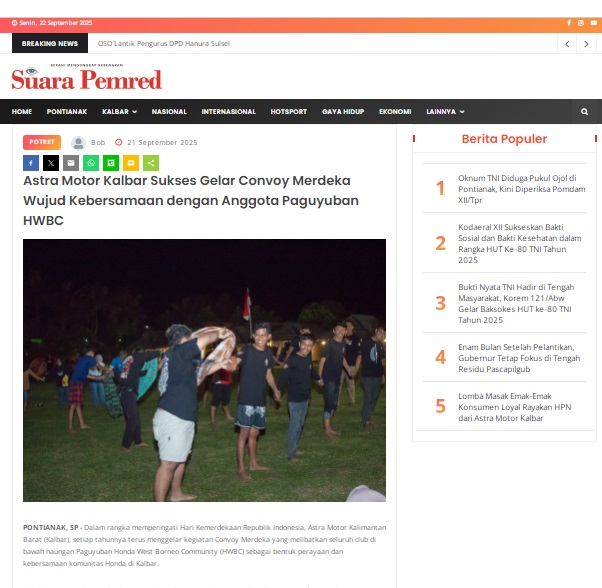 Astra Motor Kalbar Sukses Gelar Convoy Merdeka Wujud Kebersamaan dengan Anggota Paguyuban HWBC by masmul 21 September 2025 in Silahkan kunjungi https://www.suarapemredkalbar.com/read/potret/21092025/astra-motor-kalbar-sukses-gelar-convoy-merdeka-wujud-kebersamaan-dengan-anggota-paguyuban-hwbc. You Might Like Regional Public Launching New ADV160 The SUV Pride Grand Launching New PCX 160 Truly Exceptional! Tetap hati-hati ya bro sist berkendara saat hujan.