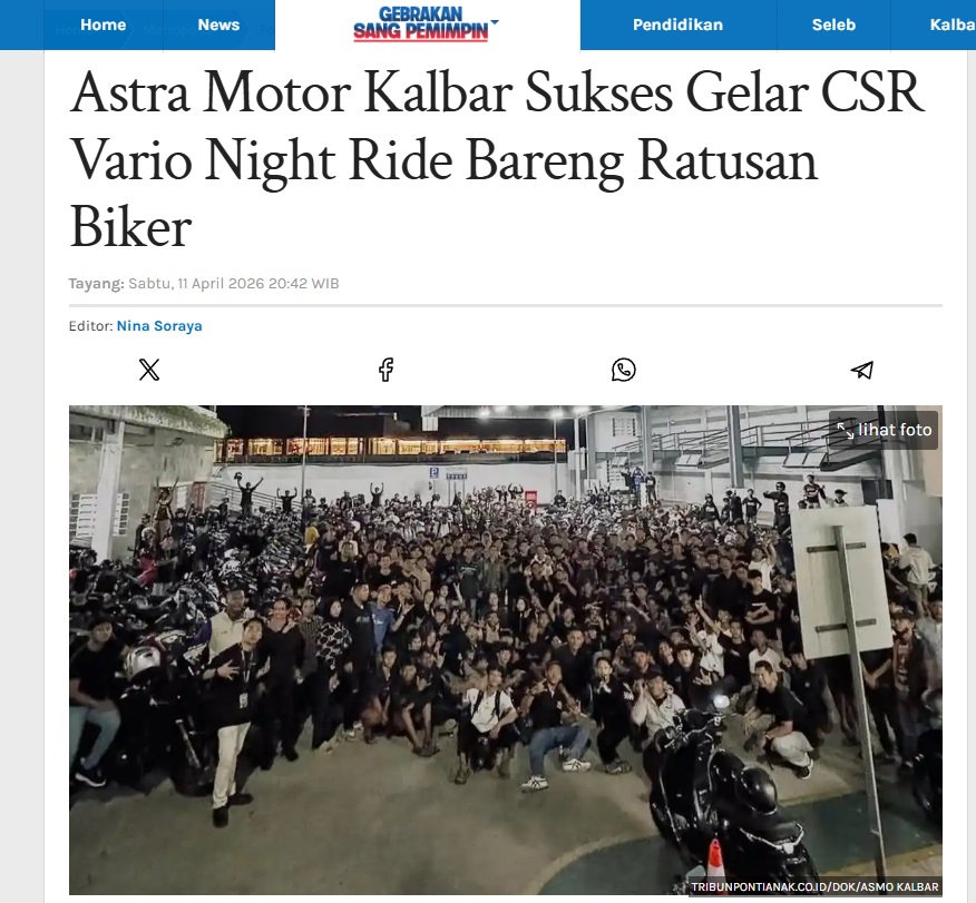 Astra Motor Kalbar Sukses Gelar CSR Vario Night Ride Bareng Ratusan Biker by Nina Soraya 11 April 2026 in Silahkan kunjungi https://pontianak.tribunnews.com/metropolis/1168497/astra-motor-kalbar-sukses-gelar-csr-vario-night-ride-bareng-ratusan-biker. You Might Like Regional Public Launching New ADV160 The SUV Pride Grand Launching New PCX 160 Truly Exceptional! Tetap hati-hati ya bro sist berkendara saat hujan.