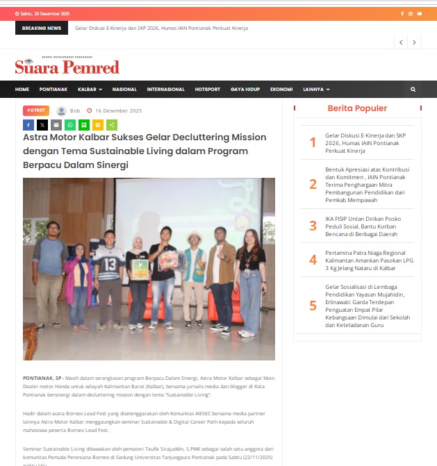 Astra Motor Kalbar Sukses Gelar Decluttering Mission dengan Tema Sustainable Living dalam Program Berpacu Dalam Sinergi by masmul 16 Desember 2025 in Silahkan kunjungi https://www.suarapemredkalbar.com/read/potret/16122025/astra-motor-kalbar-sukses-gelar-decluttering-mission-dengan-tema-sustainable-living-dalam-program-berpacu-dalam-sinergi. You Might Like Regional Public Launching New ADV160 The SUV Pride Grand Launching New PCX 160 Truly Exceptional! Tetap hati-hati ya bro sist berkendara saat hujan.