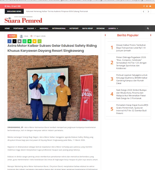 Astra Motor Kalbar Sukses Gelar Edukasi Safety Riding Khusus Karyawan Dayang Resort Singkawang by masmul 17 April 2026 in Silahkan kunjungi https://www.suarapemredkalbar.com/read/potret/17042026/astra-motor-kalbar-sukses-gelar-edukasi-safety-riding-khusus-karyawan-dayang-resort-singkawang. You Might Like Regional Public Launching New ADV160 The SUV Pride Grand Launching New PCX 160 Truly Exceptional! Tetap hati-hati ya bro sist berkendara saat hujan.