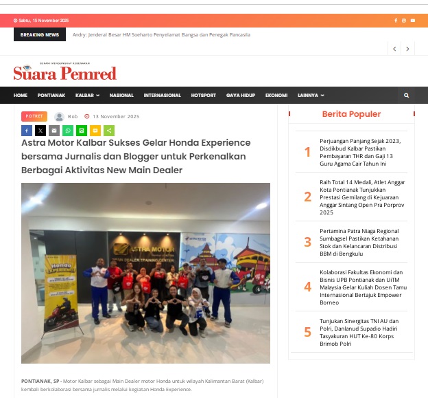 Astra Motor Kalbar Sukses Gelar Honda Experience bersama Jurnalis dan Blogger untuk Perkenalkan Berbagai Aktivitas New Main Dealer by masmul 13 November 2025 in Silahkan kunjungi https://www.suarapemredkalbar.com/read/potret/13112025/astra-motor-kalbar-sukses-gelar-honda-experience-bersama-jurnalis-dan-blogger-untuk-perkenalkan-berbagai-aktivitas-new-main-dealer. You Might Like Regional Public Launching New ADV160 The SUV Pride Grand Launching New PCX 160 Truly Exceptional! Tetap hati-hati ya bro sist berkendara saat hujan.