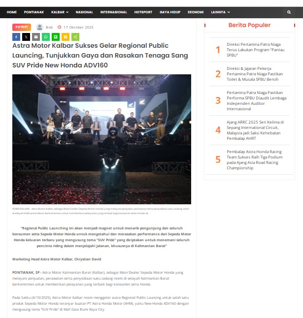 Astra Motor Kalbar Sukses Gelar Regional Public Launcing, Tunjukkan Gaya dan Rasakan Tenaga Sang SUV Pride New Honda ADV160 by masmul 17 Oktober 2025 in Silahkan kunjungi https://www.suarapemredkalbar.com/read/potret/17102025/astra-motor-kalbar-sukses-gelar-regional-public-launcing-tunjukkan-gaya-dan-rasakan-tenaga-sang-suv-pride-new-honda-adv160. You Might Like Regional Public Launching New ADV160 The SUV Pride Grand Launching New PCX 160 Truly Exceptional! Tetap hati-hati ya bro sist berkendara saat hujan.