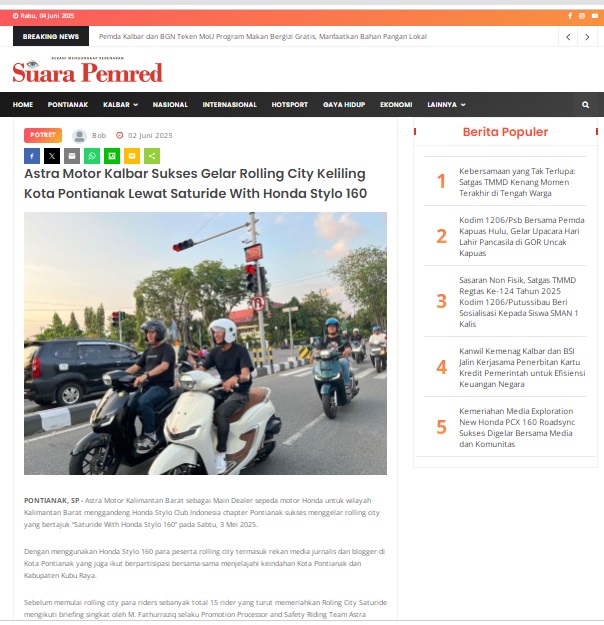 Astra Motor Kalbar Sukses Gelar Rolling City Keliling Kota Pontianak Lewat Saturide With Honda Stylo 160 by masmul 2 Juni 2025 in Silahkan kunjungi https://www.suarapemredkalbar.com/read/potret/02062025/astra-motor-kalbar-sukses-gelar-rolling-city-keliling-kota-pontianak-lewat-saturide-with-honda-stylo-160. You Might Like Regional Public Launching New ADV160 The SUV Pride Grand Launching New PCX 160 Truly Exceptional! Tetap hati-hati ya bro sist berkendara saat hujan.