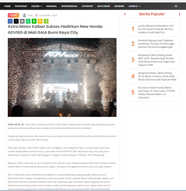 Astra Motor Kalbar Sukses Hadirkan New Honda ADV160 di Mall GAIA Bumi Raya City by masmul 13 Oktober 2025 in Silahkan kunjungi https://www.suarapemredkalbar.com/read/potret/13102025/astra-motor-kalbar-sukses-hadirkan-new-honda-adv160-di-mall-gaia-bumi-raya-city. You Might Like Regional Public Launching New ADV160 The SUV Pride Grand Launching New PCX 160 Truly Exceptional! Tetap hati-hati ya bro sist berkendara saat hujan.