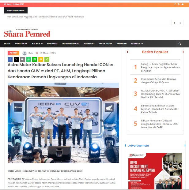 Astra Motor Kalbar Sukses Launching Honda ICON e: dan Honda CUV e: dari PT. AHM, Lengkapi Pilihan Kendaraan Ramah Lingkungan di Indonesia by masmul 18 Maret 2025 in Silahkan kunjungi https://www.suarapemredkalbar.com/read/potret/18032025/astra-motor-kalbar-sukses-launching-honda-icon-e-dan-honda-cuv-e-dari-pt-ahm-lengkapi-pilihan-kendaraan-ramah-lingkungan-di-indonesia. You Might Like Regional Public Launching New ADV160 The SUV Pride Grand Launching New PCX 160 Truly Exceptional! Tetap hati-hati ya bro sist berkendara saat hujan.