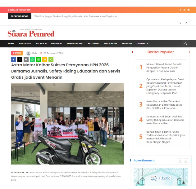 Astra Motor Kalbar Sukses Perayaaan HPN 2026 Bersama Jurnalis, Safety Riding Education dan Servis Gratis jadi Event Menarik by masmul 26 Februari 2026 in Silahkan kunjungi https://www.suarapemredkalbar.com/read/potret/26022026/astra-motor-kalbar-sukses-perayaaan-hpn-2026-bersama-jurnalis-safety-riding-education-dan-servis-gratis-jadi-event-menarin. You Might Like Regional Public Launching New ADV160 The SUV Pride Grand Launching New PCX 160 Truly Exceptional! Tetap hati-hati ya bro sist berkendara saat hujan.