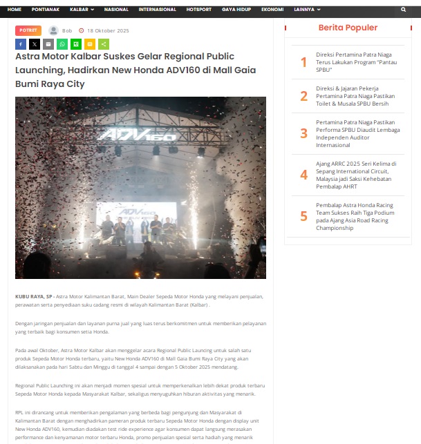 Astra Motor Kalbar Suskes Gelar Regional Public Launching, Hadirkan New Honda ADV160 di Mall Gaia Bumi Raya City by masmul 18 Oktober 2025 in Silahkan kunjungi https://www.suarapemredkalbar.com/read/potret/18102025/astra-motor-kalbar-suskes-gelar-regional-public-launching-hadirkan-new-honda-adv160-di-mall-gaia-bumi-raya-city. You Might Like Regional Public Launching New ADV160 The SUV Pride Grand Launching New PCX 160 Truly Exceptional! Tetap hati-hati ya bro sist berkendara saat hujan.