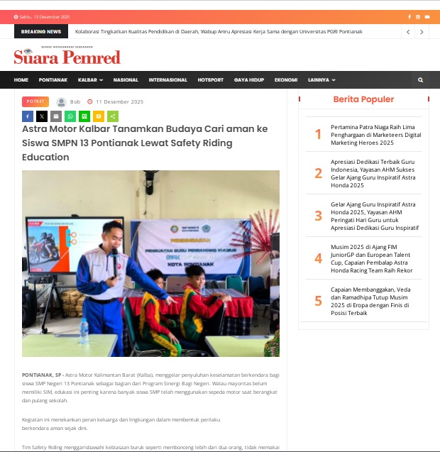 Astra Motor Kalbar Tanamkan Budaya Cari aman ke Siswa SMPN 13 Pontianak Lewat Safety Riding Education by masmul 11 Desember 2025 in Silahkan kunjungi https://www.suarapemredkalbar.com/read/potret/11122025/astra-motor-kalbar-tanamkan-budaya-cari-aman-ke-siswa-smpn-13-pontianak-lewat-safety-riding-education. You Might Like Regional Public Launching New ADV160 The SUV Pride Grand Launching New PCX 160 Truly Exceptional! Tetap hati-hati ya bro sist berkendara saat hujan.