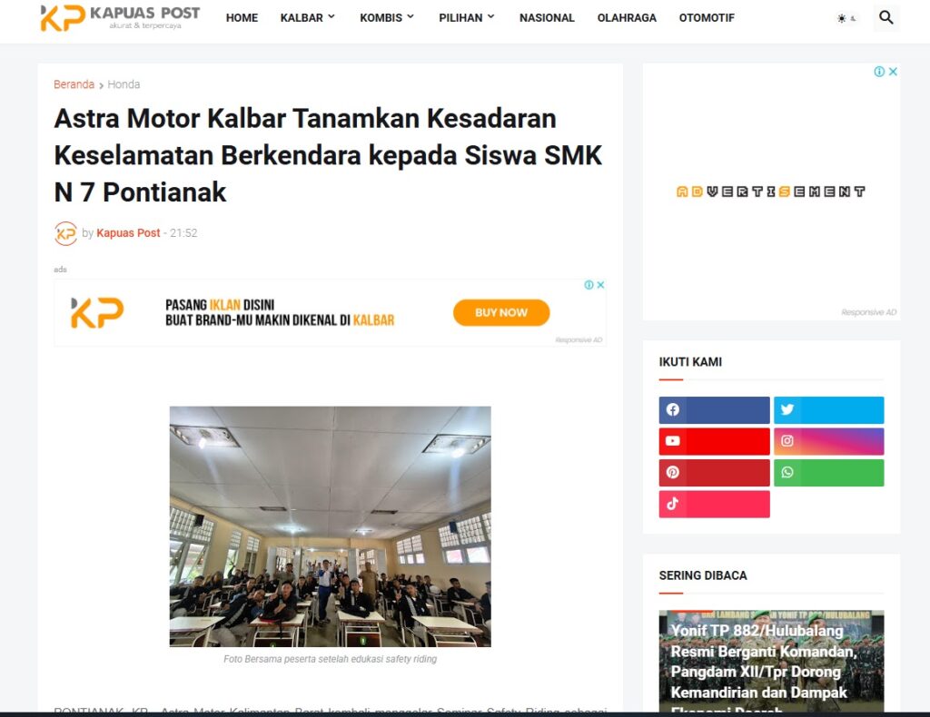 Astra Motor Kalbar Tanamkan Kesadaran Keselamatan Berkendara kepada Siswa SMK N 7 Pontianak by Muhammad Arif 22 Januari 2026 in Silahkan kunjungi https://www.kapuaspost.web.id/2026/01/astra-motor-kalbar-tanamkan-kesadaran.html. Tags: astra Astra Motor kalbar Astra Motor Pontianak astramotor honda kalbar pontianak sepeda motor You Might Like Regional Public Launching New ADV160 The SUV Pride Grand Launching New PCX 160 Truly Exceptional! Tetap hati-hati ya bro sist berkendara saat hujan.