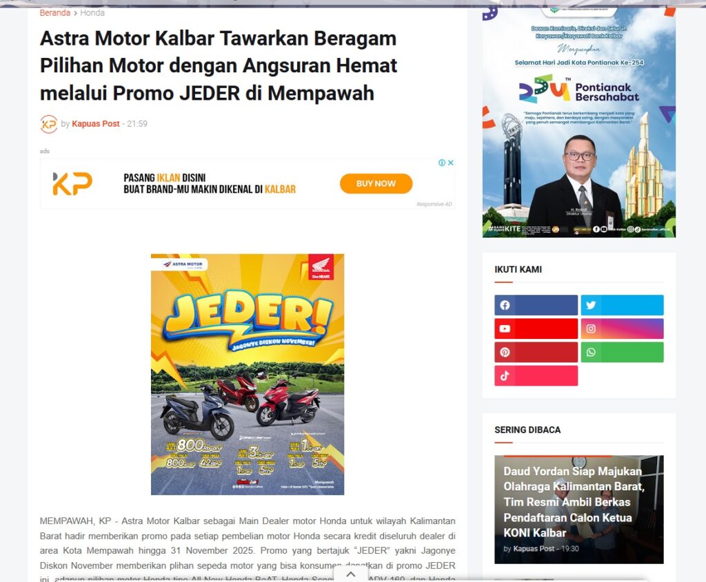 Astra Motor Kalbar Tawarkan Beragam Pilihan Motor dengan Angsuran Hemat melalui Promo JEDER di Mempawah by Muhammad Arif 15 November 2025 in Silahkan kunjungi https://www.kapuaspost.web.id/2025/11/astra-motor-kalbar-tawarkan-beragam.html. Tags: astra Astra Motor kalbar Astra Motor Pontianak astramotor honda kalbar pontianak sepeda motor You Might Like Regional Public Launching New ADV160 The SUV Pride Grand Launching New PCX 160 Truly Exceptional! Tetap hati-hati ya bro sist berkendara saat hujan.
