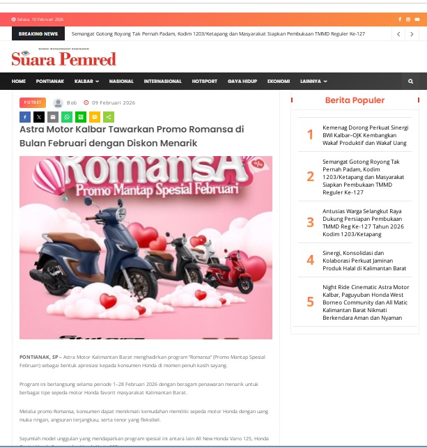 Astra Motor Kalbar Tawarkan Promo Romansa di Bulan Februari dengan Diskon Menarik by masmul 9 Februari 2026 in Silahkan kunjungi https://www.suarapemredkalbar.com/read/potret/09022026/astra-motor-kalbar-tawarkan-promo-romansa-di-bulan-februari-dengan-diskon-menarik. You Might Like Regional Public Launching New ADV160 The SUV Pride Grand Launching New PCX 160 Truly Exceptional! Tetap hati-hati ya bro sist berkendara saat hujan.