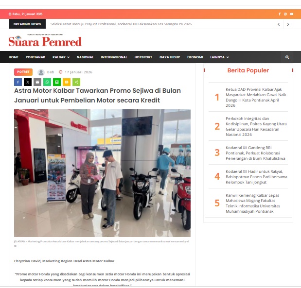 Astra Motor Kalbar Tawarkan Promo Sejiwa di Bulan Januari untuk Pembelian Motor secara Kredit by masmul 17 Januari 2026 in Silahkan kunjungi https://www.suarapemredkalbar.com/read/potret/17012026/astra-motor-kalbar-tawarkan-promo-sejiwa-di-bulan-januari-untuk-pembelian-motor-secara-kredit. You Might Like Regional Public Launching New ADV160 The SUV Pride Grand Launching New PCX 160 Truly Exceptional! Tetap hati-hati ya bro sist berkendara saat hujan.
