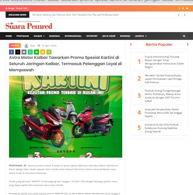 Astra Motor Kalbar Tawarkan Promo Spesial Kartini di Seluruh Jaringan Kalbar, Termasuk Pelanggan Loyal di Mempawah by masmul 16 April 2026 in Silahkan kunjungi https://www.suarapemredkalbar.com/read/potret/16042026/astra-motor-kalbar-tawarkan-promo-spesial-kartini-di-seluruh-jaringan-kalbar-termasuk-pelanggan-loyal-di-mempawah. You Might Like Regional Public Launching New ADV160 The SUV Pride Grand Launching New PCX 160 Truly Exceptional! Tetap hati-hati ya bro sist berkendara saat hujan.