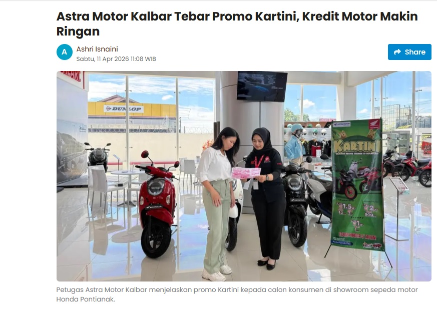Astra Motor Kalbar Tebar Promo Kartini, Kredit Motor Makin Ringan by Aristono Edi Kiswantoro 11 April 2026 in Silahkan kunjungi https://pontianakpost.jawapos.com/otomotif/2604110020/astra-motor-kalbar-tebar-promo-kartini-kredit-motor-makin-ringan. You Might Like Regional Public Launching New ADV160 The SUV Pride Grand Launching New PCX 160 Truly Exceptional! Tetap hati-hati ya bro sist berkendara saat hujan.
