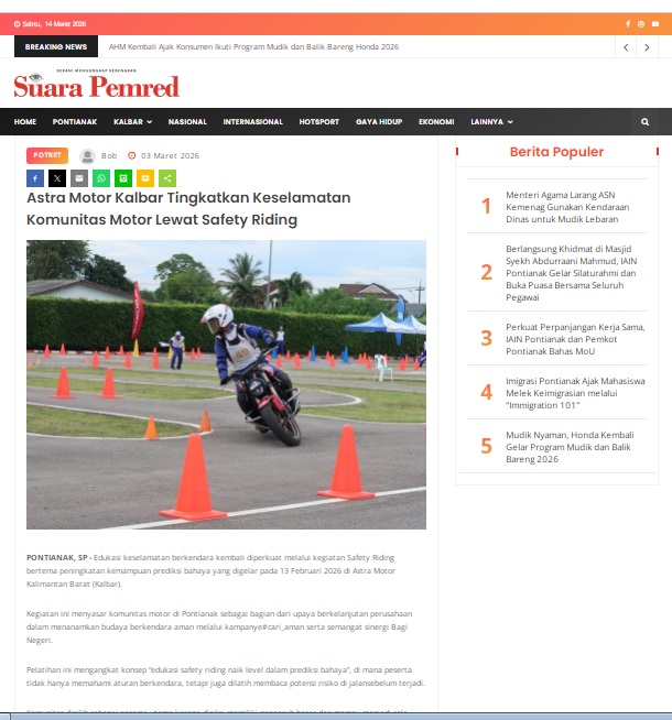 Astra Motor Kalbar Tingkatkan Keselamatan Komunitas Motor Lewat Safety Riding by masmul 3 Maret 2026 in Silahkan kunjungi https://www.suarapemredkalbar.com/read/potret/03032026/astra-motor-kalbar-tingkatkan-keselamatan-komunitas-motor-lewat-safety-riding. You Might Like Regional Public Launching New ADV160 The SUV Pride Grand Launching New PCX 160 Truly Exceptional! Tetap hati-hati ya bro sist berkendara saat hujan.