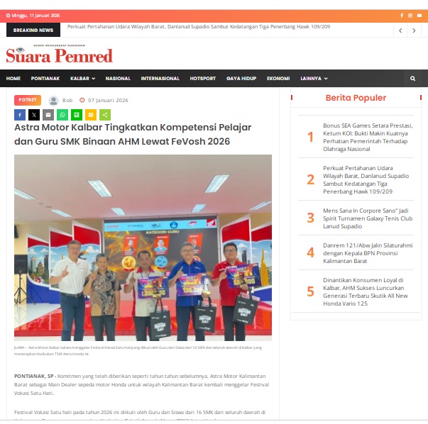 Astra Motor Kalbar Tingkatkan Kompetensi Pelajar dan Guru SMK Binaan AHM Lewat FeVosh 2026 by masmul 7 Januari 2026 in Silahkan kunjungi https://www.suarapemredkalbar.com/read/potret/07012026/astra-motor-kalbar-tingkatkan-kompetensi-pelajar-dan-guru-smk-binaan-ahm-lewat-fevosh-2026-1. You Might Like Regional Public Launching New ADV160 The SUV Pride Grand Launching New PCX 160 Truly Exceptional! Tetap hati-hati ya bro sist berkendara saat hujan.