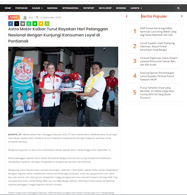 Astra Motor Kalbar Turut Rayakan Hari Pelanggan Nasional dengan Kunjungi Konsumen Loyal di Pontianak by masmul 11 September 2025 in Silahkan kunjungi https://www.suarapemredkalbar.com/read/potret/11092025/astra-motor-kalbar-turut-rayakan-hari-pelanggan-nasional-dengan-kunjungi-konsumen-loyal-di-pontianak. You Might Like Regional Public Launching New ADV160 The SUV Pride Grand Launching New PCX 160 Truly Exceptional! Tetap hati-hati ya bro sist berkendara saat hujan.