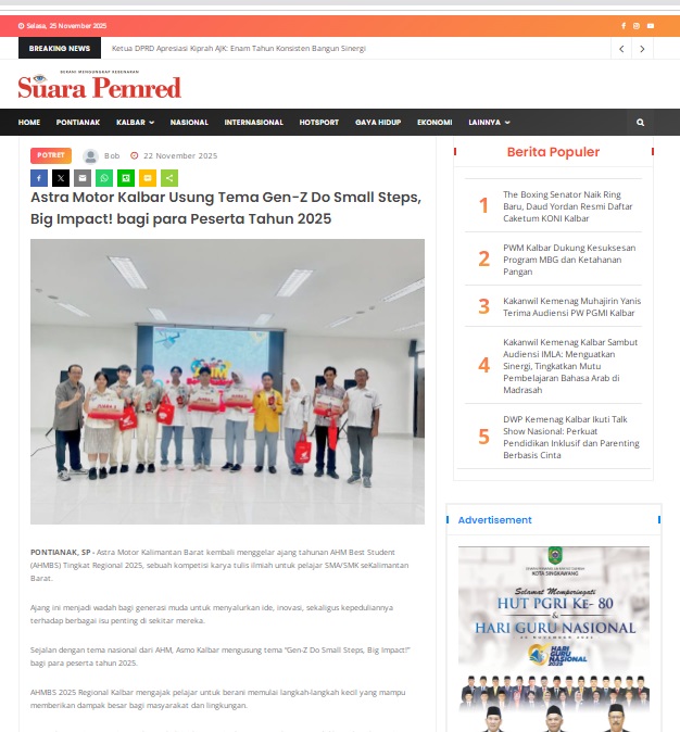Astra Motor Kalbar Usung Tema Gen-Z Do Small Steps, Big Impact! bagi para Peserta Tahun 2025 by masmul 22 November 2025 in Silahkan kunjungi https://www.suarapemredkalbar.com/read/potret/22112025/astra-motor-kalbar-usung-tema-gen-z-do-small-steps-big-impact-bagi-para-peserta-tahun-2025. You Might Like Regional Public Launching New ADV160 The SUV Pride Grand Launching New PCX 160 Truly Exceptional! Tetap hati-hati ya bro sist berkendara saat hujan.