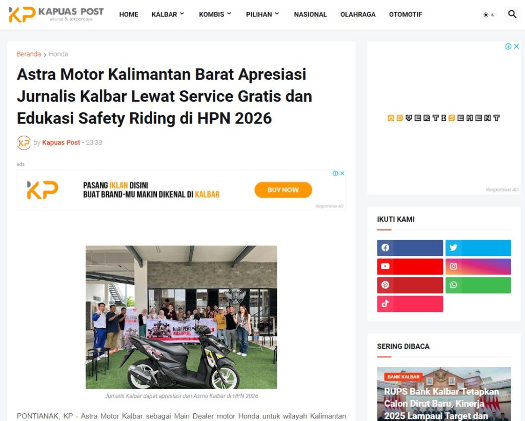 Astra Motor Kalimantan Barat Apresiasi Jurnalis Kalbar Lewat Service Gratis dan Edukasi Safety Riding di HPN 2026 by Muhammad Arif 21 Februari 2026 in Silahkan kunjungi https://www.kapuaspost.web.id/2026/02/astra-motor-kalimantan-barat-apresiasi.html. Tags: astra Astra Motor kalbar Astra Motor Pontianak astramotor honda kalbar pontianak sepeda motor You Might Like Regional Public Launching New ADV160 The SUV Pride Grand Launching New PCX 160 Truly Exceptional! Tetap hati-hati ya bro sist berkendara saat hujan.