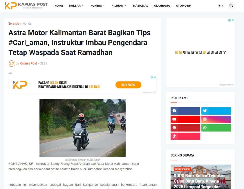 Astra Motor Kalimantan Barat Bagikan Tips #Cari_aman, Instruktur Imbau Pengendara Tetap Waspada Saat Ramadhan by Muhammad Arif 23 Februari 2026 in Silahkan kunjungi https://www.kapuaspost.web.id/2026/02/astra-motor-kalimantan-barat-bagikan.html. Tags: astra Astra Motor kalbar Astra Motor Pontianak astramotor honda kalbar pontianak sepeda motor You Might Like Regional Public Launching New ADV160 The SUV Pride Grand Launching New PCX 160 Truly Exceptional! Tetap hati-hati ya bro sist berkendara saat hujan.