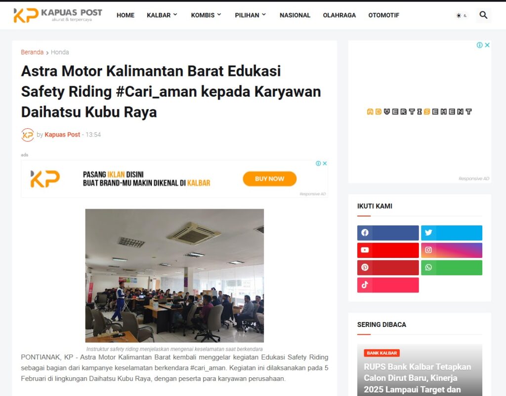 Astra Motor Kalimantan Barat Edukasi Safety Riding #Cari_aman kepada Karyawan Daihatsu Kubu Raya by Muhammad Arif 20 Februari 2026 in Silahkan kunjungi https://www.kapuaspost.web.id/2026/02/astra-motor-kalimantan-barat-edukasi_22.html. Tags: astra Astra Motor kalbar Astra Motor Pontianak astramotor honda kalbar pontianak sepeda motor You Might Like Regional Public Launching New ADV160 The SUV Pride Grand Launching New PCX 160 Truly Exceptional! Tetap hati-hati ya bro sist berkendara saat hujan.