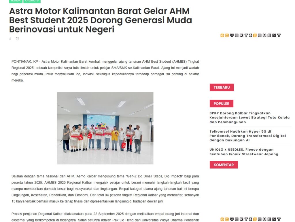 Astra Motor Kalimantan Barat Gelar AHM Best Student 2025 Dorong Generasi Muda Berinovasi untuk Negeri by Muhammad Arif 4 Oktober 2025 in Silahkan kunjungi https://www.kapuaspost.web.id/2025/10/astra-motor-kalimantan-barat-gelar-ahm.html. Tags: astra Astra Motor kalbar Astra Motor Pontianak astramotor honda kalbar pontianak sepeda motor You Might Like Regional Public Launching New ADV160 The SUV Pride Grand Launching New PCX 160 Truly Exceptional! Tetap hati-hati ya bro sist berkendara saat hujan.