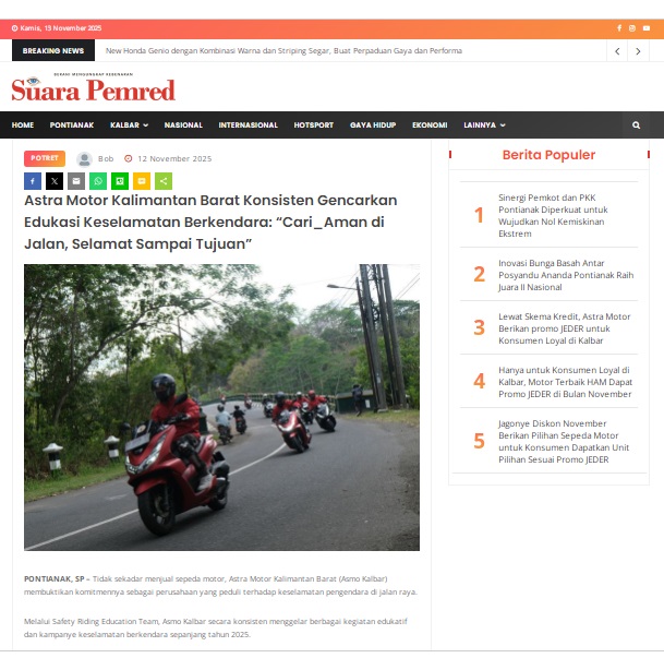 Astra Motor Kalimantan Barat Konsisten Gencarkan Edukasi Keselamatan Berkendara: “Cari_Aman di Jalan, Selamat Sampai Tujuan” by masmul 12 November 2025 in Silahkan kunjungi https://www.suarapemredkalbar.com/read/potret/12112025/astra-motor-kalimantan-barat-konsisten-gencarkan-edukasi-keselamatan-berkendara-cari_aman-di-jalan-selamat-sampai-tujuan. You Might Like Regional Public Launching New ADV160 The SUV Pride Grand Launching New PCX 160 Truly Exceptional! Tetap hati-hati ya bro sist berkendara saat hujan.