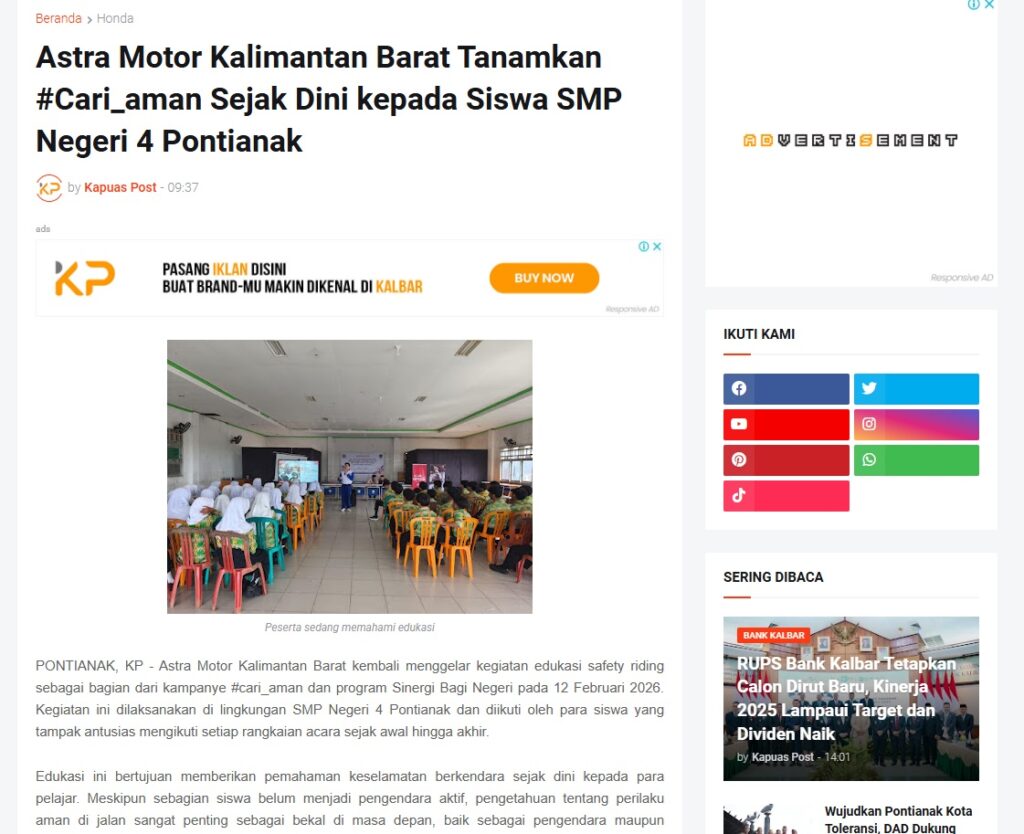 Astra Motor Kalimantan Barat Tanamkan #Cari_aman Sejak Dini kepada Siswa SMP Negeri 4 Pontianak by Muhammad Arif 25 Februari 2026 in Silahkan kunjungi https://www.kapuaspost.web.id/2026/02/astra-motor-kalimantan-barat-tanamkan.html. Tags: astra Astra Motor kalbar Astra Motor Pontianak astramotor honda kalbar pontianak sepeda motor You Might Like Regional Public Launching New ADV160 The SUV Pride Grand Launching New PCX 160 Truly Exceptional! Tetap hati-hati ya bro sist berkendara saat hujan.