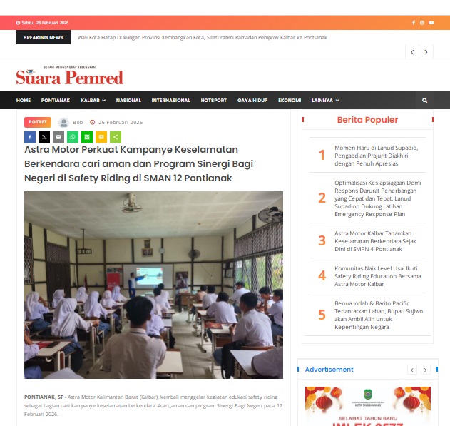 Astra Motor Perkuat Kampanye Keselamatan Berkendara cari aman dan Program Sinergi Bagi Negeri di Safety Riding di SMAN 12 Pontianak by masmul 26 Februari 2026 in Silahkan kunjungi https://www.suarapemredkalbar.com/read/potret/26022026/astra-motor-perkuat-kampanye-keselamatan-berkendara-cari-aman-dan-program-sinergi-bagi-negeridi-safety-riding-di-sman-12-pontianak. You Might Like Regional Public Launching New ADV160 The SUV Pride Grand Launching New PCX 160 Truly Exceptional! Tetap hati-hati ya bro sist berkendara saat hujan.