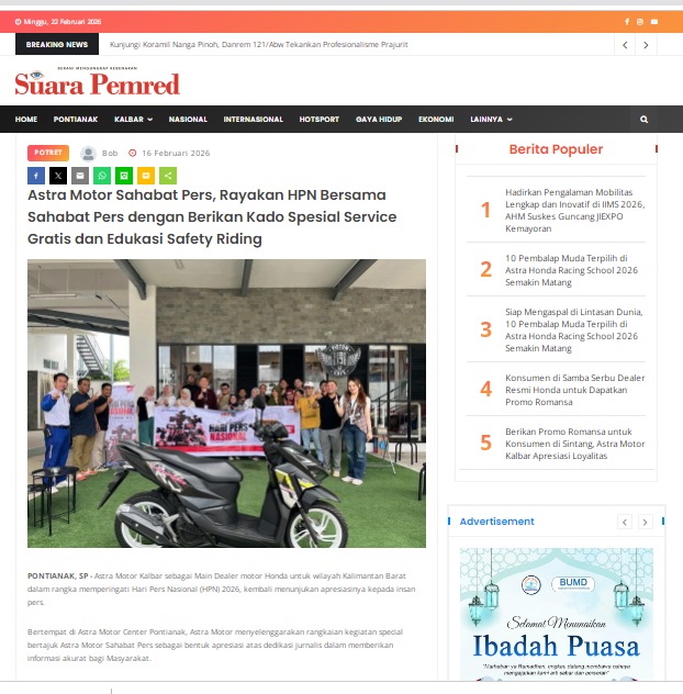 Astra Motor Sahabat Pers, Rayakan HPN Bersama Sahabat Pers dengan Berikan Kado Spesial Service Gratis dan Edukasi Safety Riding by masmul 16 Februari 2026 in Silahkan kunjungi https://www.suarapemredkalbar.com/read/potret/16022026/astra-motor-sahabat-pers-rayakan-hpn-bersama-sahabat-pers-dengan-berikan-kado-spesial-service-gratis-dan-edukasi-safety-riding. You Might Like Regional Public Launching New ADV160 The SUV Pride Grand Launching New PCX 160 Truly Exceptional! Tetap hati-hati ya bro sist berkendara saat hujan.