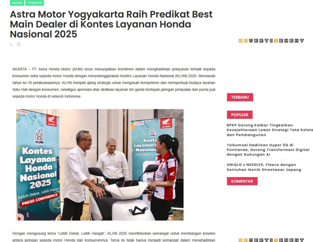 Astra Motor Yogyakarta Raih Predikat Best Main Dealer di Kontes Layanan Honda Nasional 2025 by Muhammad Arif 5 Oktober 2025 in Silahkan kunjungi https://www.kapuaspost.web.id/2025/10/astra-motor-yogyakarta-raih-predikat.html. Tags: astra Astra Motor kalbar Astra Motor Pontianak astramotor honda kalbar pontianak sepeda motor You Might Like Regional Public Launching New ADV160 The SUV Pride Grand Launching New PCX 160 Truly Exceptional! Tetap hati-hati ya bro sist berkendara saat hujan.