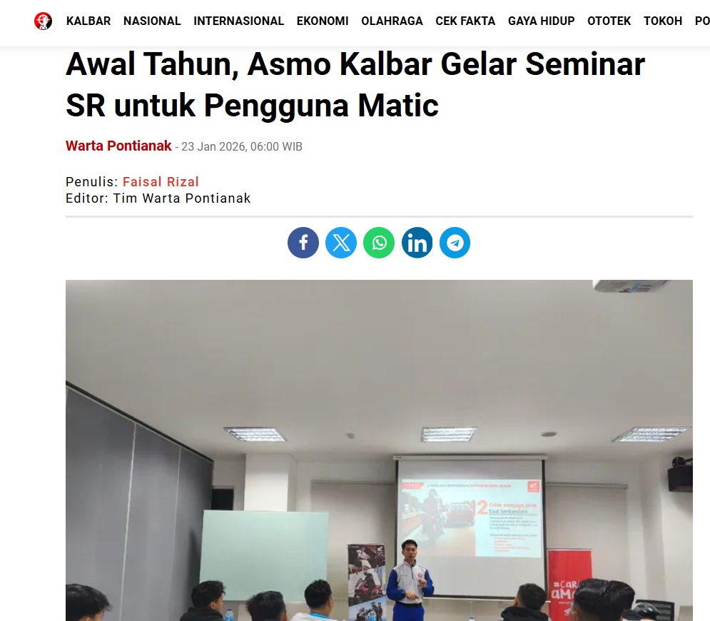 Awal Tahun, Asmo Kalbar Gelar Seminar SR untuk Pengguna Matic by Faisal Rizal 23 Januari 2026 in Silahkan kunjungi https://wartapontianak.pikiran-rakyat.com/gaya-hidup/pr-1179952322/awal-tahun-asmo-kalbar-gelar-seminar-sr-untuk-pengguna-matic. You Might Like Regional Public Launching New ADV160 The SUV Pride Grand Launching New PCX 160 Truly Exceptional! Tetap hati-hati ya bro sist berkendara saat hujan.