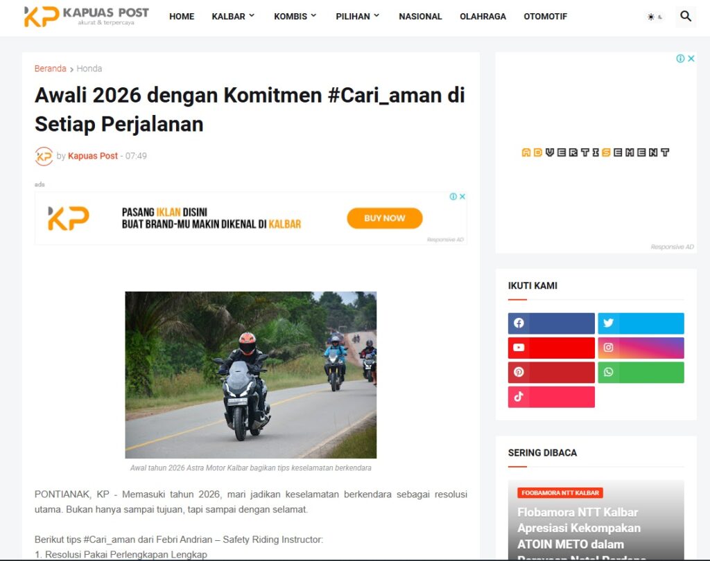 Awali 2026 dengan Komitmen #Cari_aman di Setiap Perjalanan by Muhammad Arif 4 Februari 2026 in Silahkan kunjungi https://www.kapuaspost.web.id/2026/02/awali-2026-dengan-komitmen-cariaman-di.html. Tags: astra Astra Motor kalbar Astra Motor Pontianak astramotor honda kalbar pontianak sepeda motor You Might Like Regional Public Launching New ADV160 The SUV Pride Grand Launching New PCX 160 Truly Exceptional! Tetap hati-hati ya bro sist berkendara saat hujan.