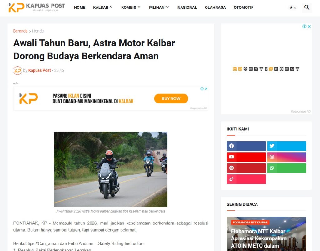 Awali Tahun Baru, Astra Motor Kalbar Dorong Budaya Berkendara Aman by Muhammad Arif 1 Februari 2026 in Silahkan kunjungi https://www.kapuaspost.web.id/2026/02/awali-tahun-baru-astra-motor-kalbar.html. Tags: astra Astra Motor kalbar Astra Motor Pontianak astramotor honda kalbar pontianak sepeda motor You Might Like Regional Public Launching New ADV160 The SUV Pride Grand Launching New PCX 160 Truly Exceptional! Tetap hati-hati ya bro sist berkendara saat hujan.