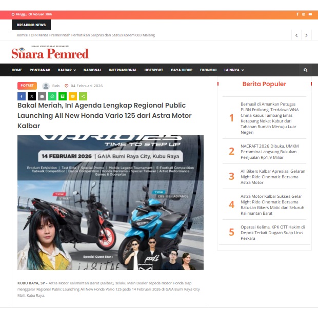 Bakal Meriah, InI Agenda Lengkap Regional Public Launching All New Honda Vario 125 dari Astra Motor Kalbar by masmul 4 Februari 2026 in Silahkan kunjungi https://www.suarapemredkalbar.com/read/potret/04022026/bakal-meriah-ini-agenda-lengkap-regional-public-launching-all-new-honda-vario-125-dari-astra-motor-kalbar. You Might Like Regional Public Launching New ADV160 The SUV Pride Grand Launching New PCX 160 Truly Exceptional! Tetap hati-hati ya bro sist berkendara saat hujan.