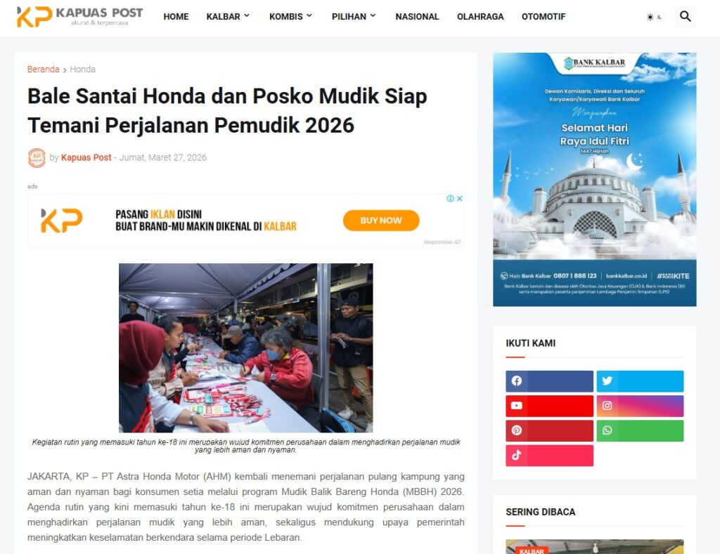 Bale Santai Honda dan Posko Mudik Siap Temani Perjalanan Pemudik 2026 by Muhammad Arif 27 Maret 2026 in Silahkan kunjungi https://www.kapuaspost.web.id/2026/03/bale-santai-honda-dan-posko-mudik-siap.html. Tags: astra Astra Motor kalbar Astra Motor Pontianak astramotor honda kalbar pontianak sepeda motor You Might Like Regional Public Launching New ADV160 The SUV Pride Grand Launching New PCX 160 Truly Exceptional! Tetap hati-hati ya bro sist berkendara saat hujan.