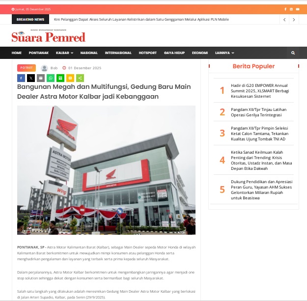 Bangunan Megah dan Multifungsi, Gedung Baru Main Dealer Astra Motor Kalbar jadi Kebanggaan by masmul 1 Desember 2025 in Silahkan kunjungi https://www.suarapemredkalbar.com/read/potret/01122025/bangunan-megah-dan-multifungsi-gedung-baru-main-dealer-astra-motor-kalbar-jadi-kebanggaan. You Might Like Regional Public Launching New ADV160 The SUV Pride Grand Launching New PCX 160 Truly Exceptional! Tetap hati-hati ya bro sist berkendara saat hujan.