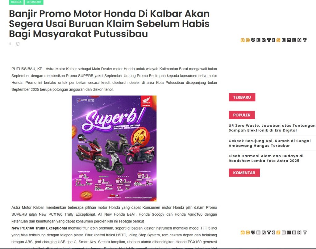 Banjir Promo Motor Honda Di Kalbar Akan Segera Usai Buruan Klaim Sebelum Habis Bagi Masyarakat Putussibau by Muhammad Arif 24 September 2025 in Silahkan kunjungi https://www.kapuaspost.web.id/2025/09/banjir-promo-motor-honda-di-kalbar-akan.html. Tags: astra Astra Motor kalbar Astra Motor Pontianak astramotor honda kalbar pontianak sepeda motor You Might Like Regional Public Launching New ADV160 The SUV Pride Grand Launching New PCX 160 Truly Exceptional! Tetap hati-hati ya bro sist berkendara saat hujan.