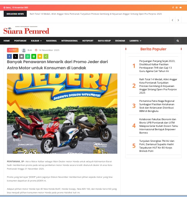 Banyak Penawaran Menarik dari Promo Jeder dari Astra Motor untuk Konsumen di Landak by masmul 14 November 2025 in Silahkan kunjungi https://www.suarapemredkalbar.com/read/potret/14112025/banyak-penawaran-menarik-dari-promo-jeder-dari-astra-motor-untuk-konsumen-di-landak. You Might Like Regional Public Launching New ADV160 The SUV Pride Grand Launching New PCX 160 Truly Exceptional! Tetap hati-hati ya bro sist berkendara saat hujan.