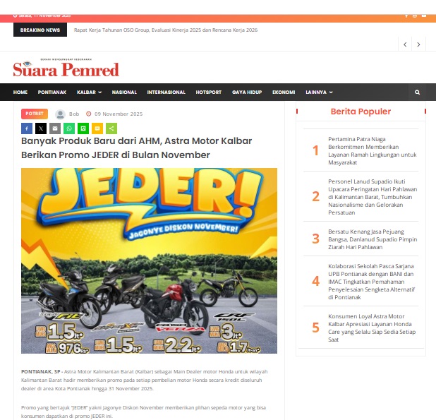 Banyak Produk Baru dari AHM, Astra Motor Kalbar Berikan Promo JEDER di Bulan November by masmul 9 November 2025 in Silahkan kunjungi https://www.suarapemredkalbar.com/read/potret/09112025/banyak-produk-baru-dari-ahm-astra-motor-kalbar-berikan-promo-jeder-di-bulan-november. You Might Like Regional Public Launching New ADV160 The SUV Pride Grand Launching New PCX 160 Truly Exceptional! Tetap hati-hati ya bro sist berkendara saat hujan.