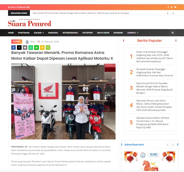 Banyak Tawaran Menarik, Promo Romansa Astra Motor Kalbar Dapat Dipesan Lewat Aplikasi Motorku X by masmul 23 Februari 2026 in Silahkan kunjungi https://www.suarapemredkalbar.com/read/potret/23022026/banyak-tawaran-menarik-promo-romansa-astra-motor-kalbar-dapat-dipesan-lewat-aplikasi-motorku-x. You Might Like Regional Public Launching New ADV160 The SUV Pride Grand Launching New PCX 160 Truly Exceptional! Tetap hati-hati ya bro sist berkendara saat hujan.