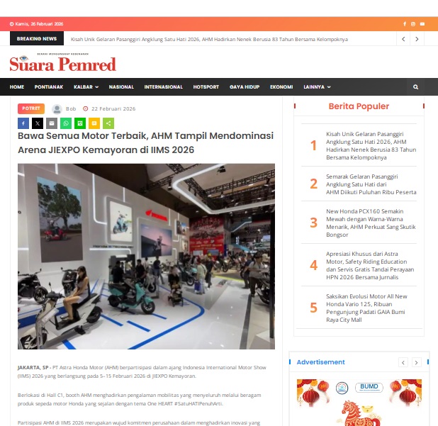 Bawa Semua Motor Terbaik, AHM Tampil Mendominasi Arena JIEXPO Kemayoran di IIMS 2026 by masmul 22 Februari 2026 in Silahkan kunjungi https://www.suarapemredkalbar.com/read/potret/22022026/bawa-semua-motor-terbaik-ahm-tampil-mendominasi-arena-jiexpo-kemayoran-di-iims-2026. You Might Like Regional Public Launching New ADV160 The SUV Pride Grand Launching New PCX 160 Truly Exceptional! Tetap hati-hati ya bro sist berkendara saat hujan.