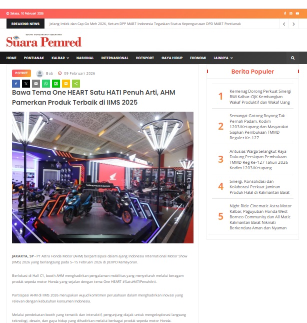 Bawa Tema One HEART Satu HATI Penuh Arti, AHM Pamerkan Produk Terbaik di IIMS 2025 by masmul 9 Februari 2026 in Silahkan kunjungi https://www.suarapemredkalbar.com/read/potret/09022026/bawa-tema-one-heart-satu-hati-penuh-arti-ahm-pamerkan-produk-terbaik-di-iims-2025. You Might Like Regional Public Launching New ADV160 The SUV Pride Grand Launching New PCX 160 Truly Exceptional! Tetap hati-hati ya bro sist berkendara saat hujan.