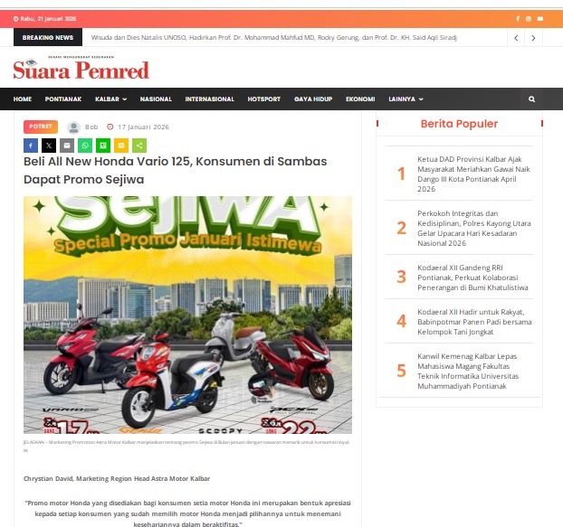 Beli All New Honda Vario 125, Konsumen di Sambas Dapat Promo Sejiwa by masmul 17 Januari 2026 in Silahkan kunjungi https://www.suarapemredkalbar.com/read/potret/17012026/beli-all-new-honda-vario-125-konsumen-di-sambas-dapat-promo-sejiwa. You Might Like Regional Public Launching New ADV160 The SUV Pride Grand Launching New PCX 160 Truly Exceptional! Tetap hati-hati ya bro sist berkendara saat hujan.