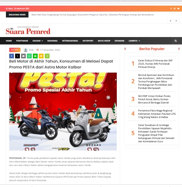 Beli Motor di Akhir Tahun, Konsumen di Melawi Dapat Promo PESTA dari Astra Motor Kalbar by masmul 17 Desember 2025 in Silahkan kunjungi https://www.suarapemredkalbar.com/read/potret/17122025/beli-motor-di-akhir-tahun-konsumen-di-melawi-dapat-promo-pesta-dari-astra-motor-kalbar. You Might Like Regional Public Launching New ADV160 The SUV Pride Grand Launching New PCX 160 Truly Exceptional! Tetap hati-hati ya bro sist berkendara saat hujan.