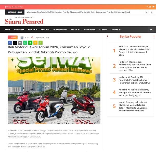 Beli Motor di Awal Tahun 2026, Konsumen Loyal di Kabupaten Landak Nikmati Promo Sejiwa by masmul 19 Januari 2026 in Silahkan kunjungi https://www.suarapemredkalbar.com/read/potret/19012026/beli-motor-di-awal-tahun-2026-konsumen-loyal-di-kabupaten-landak-nikmati-promo-sejiwa. You Might Like Regional Public Launching New ADV160 The SUV Pride Grand Launching New PCX 160 Truly Exceptional! Tetap hati-hati ya bro sist berkendara saat hujan.