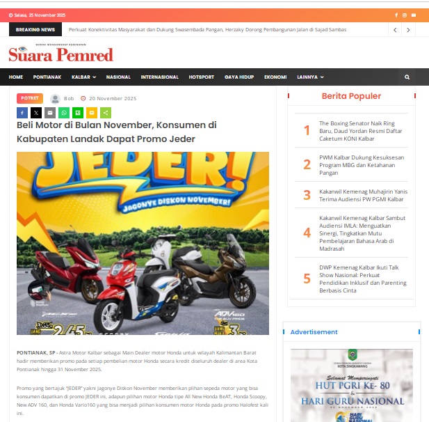 Beli Motor di Bulan November, Konsumen di Kabupaten Landak Dapat Promo Jeder Photo of Beli Motor di Bulan November, Konsumen di Kabupaten Landak Dapat Promo Jeder by masmul 20 November 2025 in Silahkan kunjungi https://www.suarapemredkalbar.com/read/potret/20112025/beli-motor-di-bulan-november-konsumen-di-kabupaten-landak-dapat-promo-jeder. You Might Like Regional Public Launching New ADV160 The SUV Pride Grand Launching New PCX 160 Truly Exceptional! Tetap hati-hati ya bro sist berkendara saat hujan.